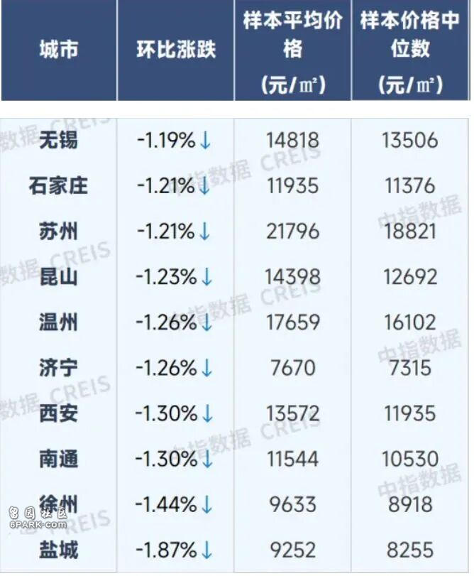 在二手住宅价格环比下跌的城市中,盐城(-1.87%)、徐州(-1.44%)、南通(-1.30%)、西安(-1.30%)、济宁(-1.26%)等城市环比跌幅靠前。