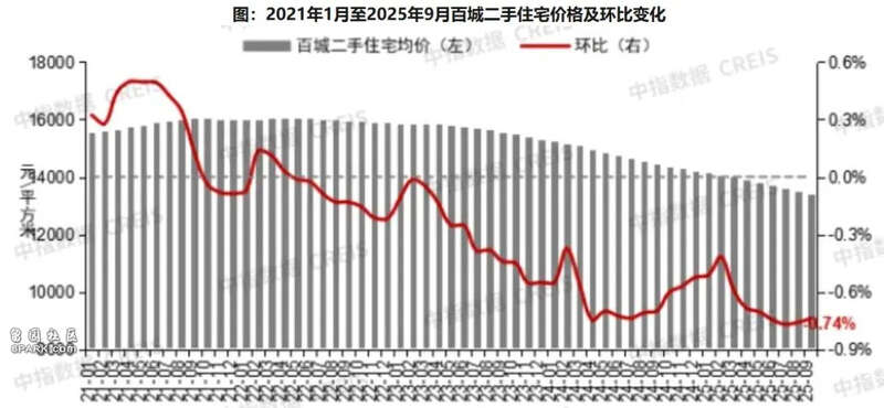 数据显示,9月百城二手住宅均价为13381元/平方米,环比下跌0.74%,同比下跌7.38%;第三季度,百城二手住宅价格累计下跌2.26%,跌幅较二季度扩大0.14个百分点;前三季度, 百城二手住宅价格累计下跌5.79%,市场调整幅度持续加深。