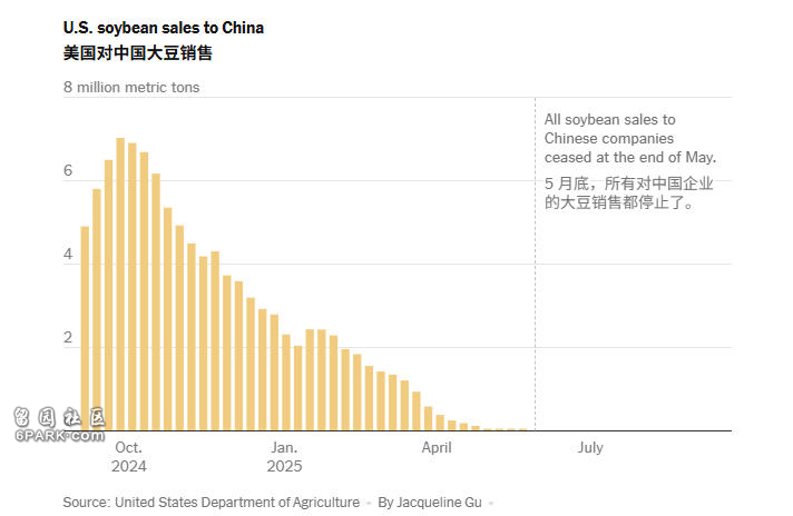 中国买家的美国大豆采购量已跌至零 美国《纽约时报》制图