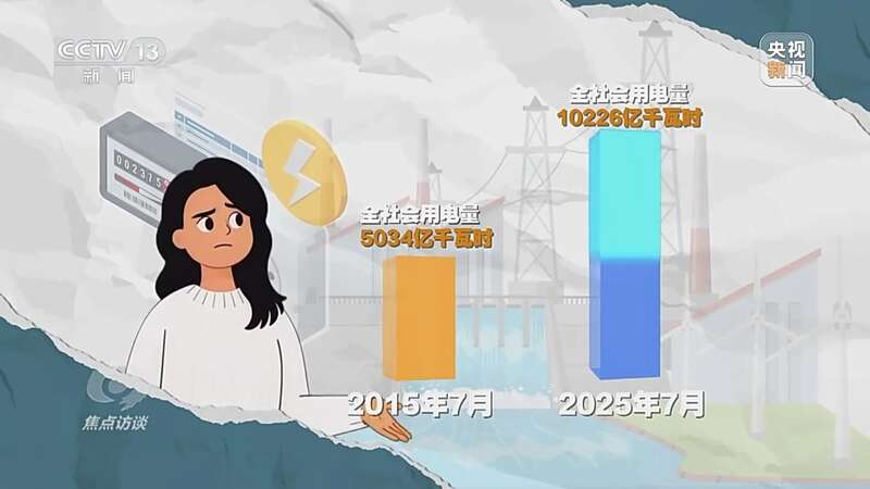 用电量一直被看作是经济的“晴雨表”,记者查询了一下十年前,也就是2015年夏天的数据,纵向一比,发现我国今年7月的用电量比十年前的7月翻了一番。这些电都用在哪儿了呢?