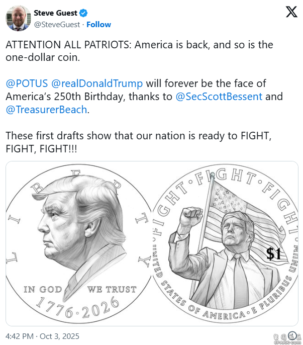 对此,比奇也在社交平台X上表示:「这里没有假新闻(No fake news here),这些为纪念美国250周年诞辰而创作的初稿皆属真实」,并表示一旦联邦政府停摆危机告终,将尽快分享更多消息。财政部长班森特(Scott Bessent)亦转发该则贴文,证实财政部将打造有总统川普头像、面额1美元的硬币。