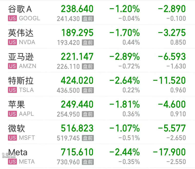 大型科技股普跌,亚马逊、特斯拉、Meta跌超2%,谷歌、英伟达、苹果、微软跌超1%。