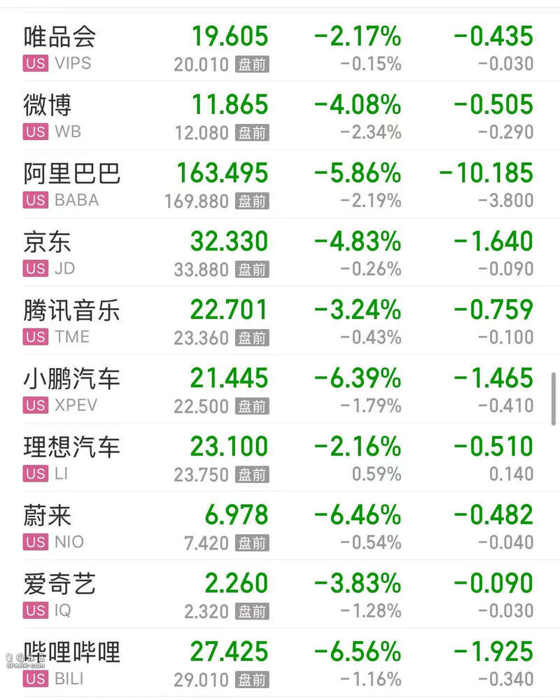 中概股总体表现相对弱势,蔚来、小鹏汽车、哔哩哔哩跌超6%,阿里巴巴跌超5%,京东、微博跌超4%,爱奇艺跌超3%。