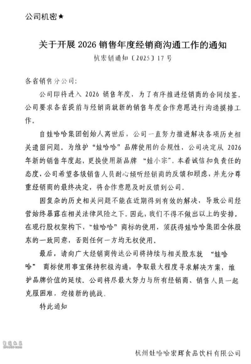 面对商标归属的法律不确定性以及集团内部复杂的股东博弈,宗馥莉选择开辟一条新路径。今年9月13日,就在宗馥莉正式提出辞职的一天后,一份题为《关于开展2026销售年度经销商沟通工作的通知》的文件在网络上广泛传播,宗馥莉方决定从2026销售年度起,全面启用新品牌“娃小宗”。