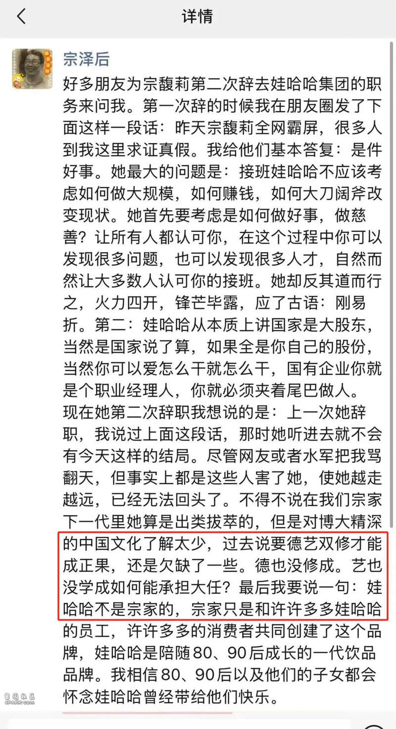 此前,在宗馥莉第一次辞职时,宗泽后曾发在朋友圈发表引发全网关注的言论,指宗馥莉火力四开,锋芒毕露,“过刚易折”。