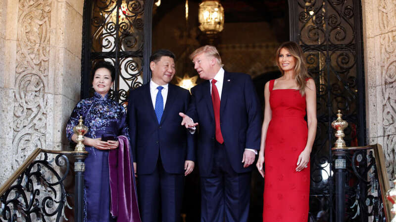 资料照片:2017年4月6日,美国佛罗里达州棕榈滩,美国总统唐纳德-特朗普与中国国家主席习近平在马阿拉歌山庄共进晚餐前交谈,两人与他们的夫人、美国第一夫人梅拉尼娅-特朗普(Melania Trump)和中国第一夫人彭丽媛(Peng Liyuan)一起合影留念。 AP – Alex Brandon