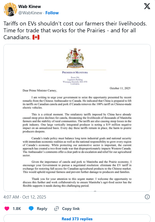 这一表态迅速引发加拿大草原省份领导人的关注,他们表示本国农民长期因中方惩罚性关税而受损。
