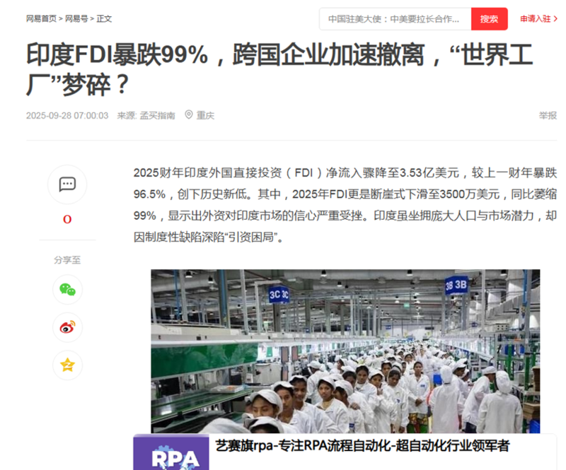 其实早在2024年,印度经济就出现了衰颓迹象,印度一系列“印度赚钱印度花、一分别想带回家”的政策,已经引起外资大规模撤离。