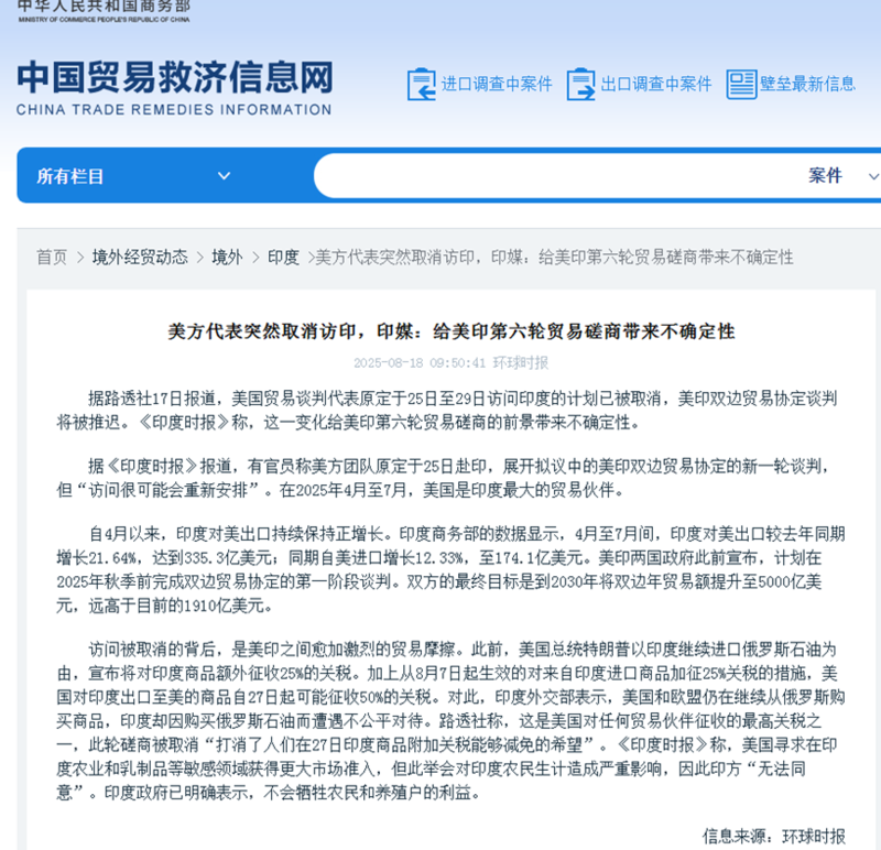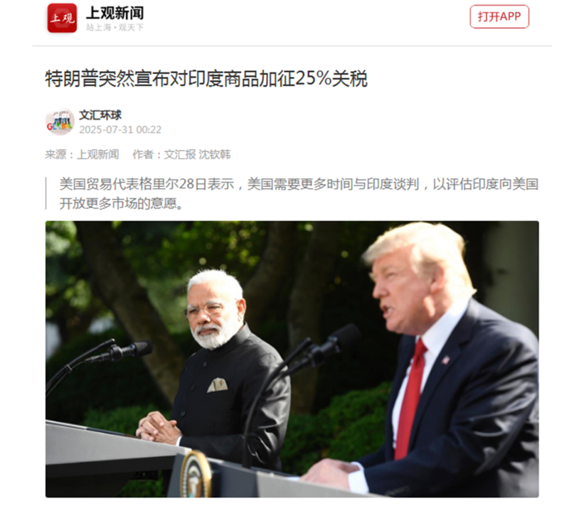 8月1日,美对印征收25%的对等关税。到8月6日,美对印再征收25%的惩罚性关税,使得总税率达到50%。