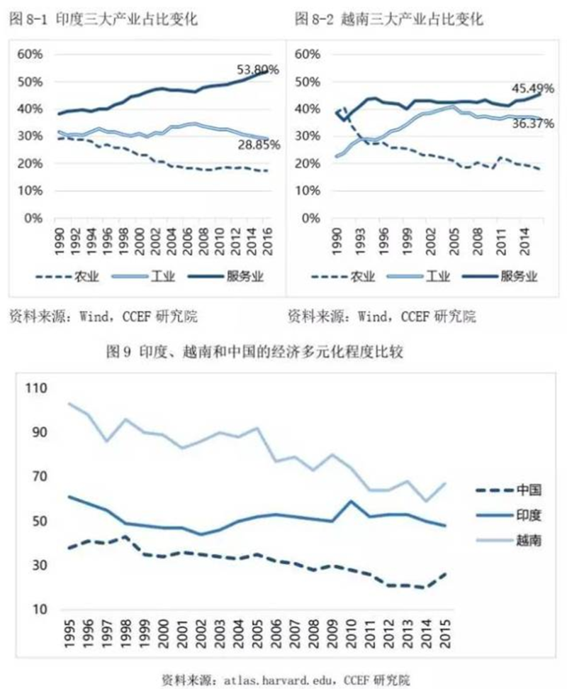 印度经济在从未真正实现工业化的情况下,发展路径直接向服务业倾斜,其服务业占比高达50%以上,而制造业却长期徘徊在15%左右。