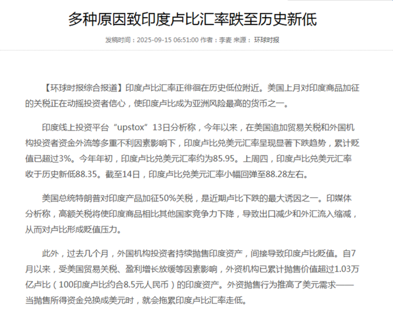 2025年9月,印度卢比兑美元汇率跌穿88关口,触及88.44的历史新低,成为今年以来亚洲表现最差的货币。