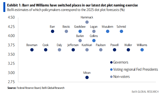 理事米兰(Miran):是旗帜鲜明的“超级鸽派”,认为今年应总共降息150个基点,是点阵图中的“最低点”。