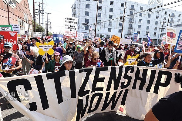 10月4日,美国洛杉矶,多个工会和移民权益组织的成员举行以“我们人民崛起——停止仇恨,停止突袭”为主题的游行和集会。 IC Photo