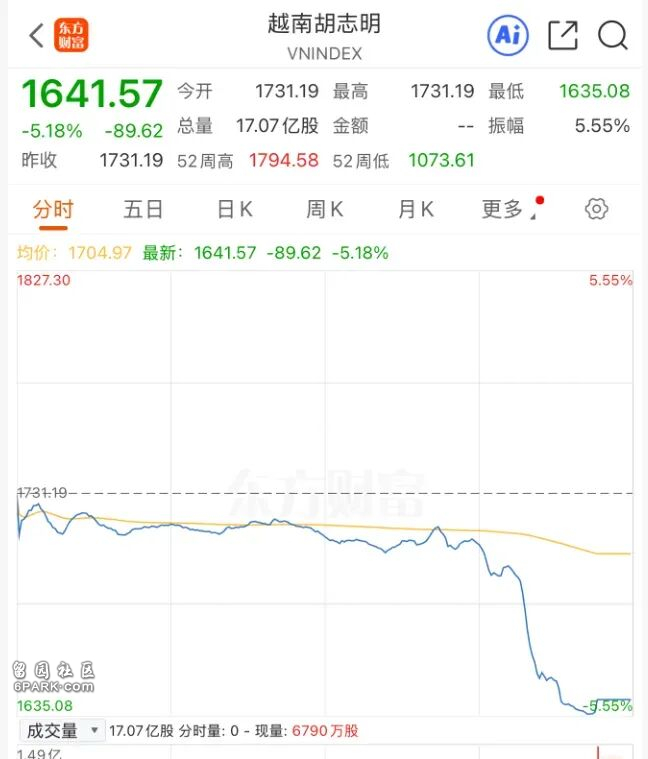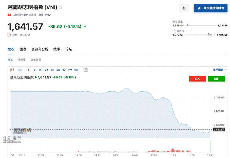 截至收盘,胡志明指数暴跌5.18%,报1641.57点,较上周创下的历史新高1794.58点大幅回落,同时创下近半年最大单日点数跌幅(-94.76点),另外,更具代表性的MSCI越南指数跌幅达5.85%。