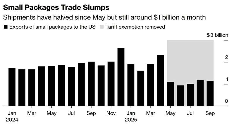 中国对美的小包裹出口额。彭博社制图