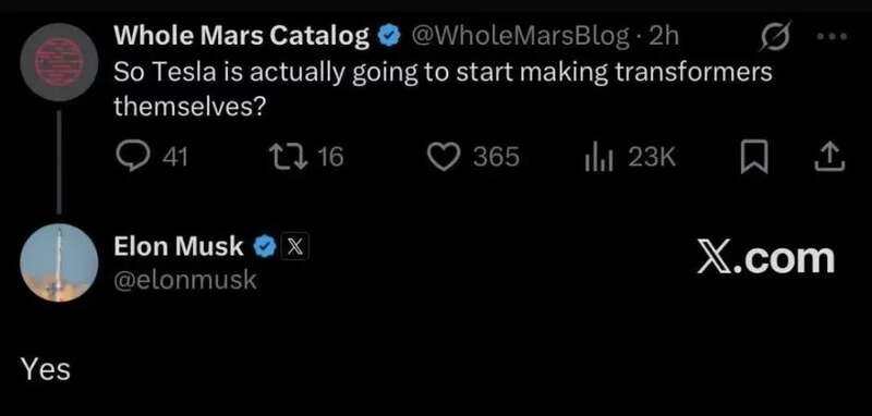 社交媒体上,网友问及“特斯拉真要开始自己做变压器了”时,马斯克明确给出肯定的答复