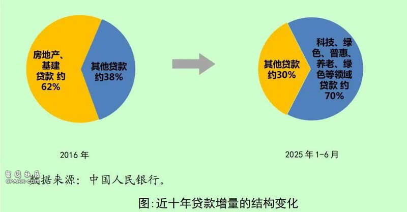央行最近的一份报告显示,我国新增贷款结构已由2016年的房地产、基建贷款占比超过六成,转变为目前的金融“五篇大文章”领域贷款占比约七成。