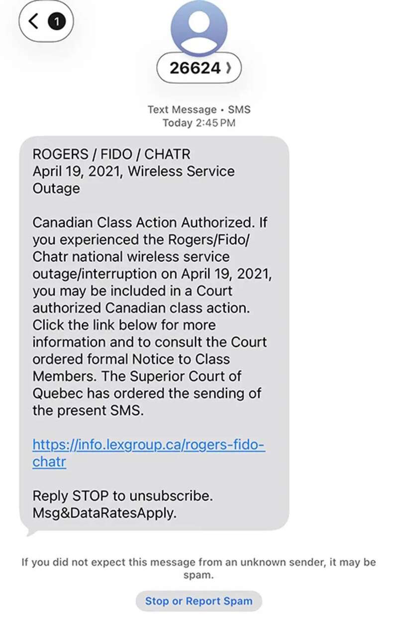 许多加拿大人在本周二收到一条短信,内容涉及针对Rogers的集体诉讼。如果你也收到了,别慌,这不是诈骗!