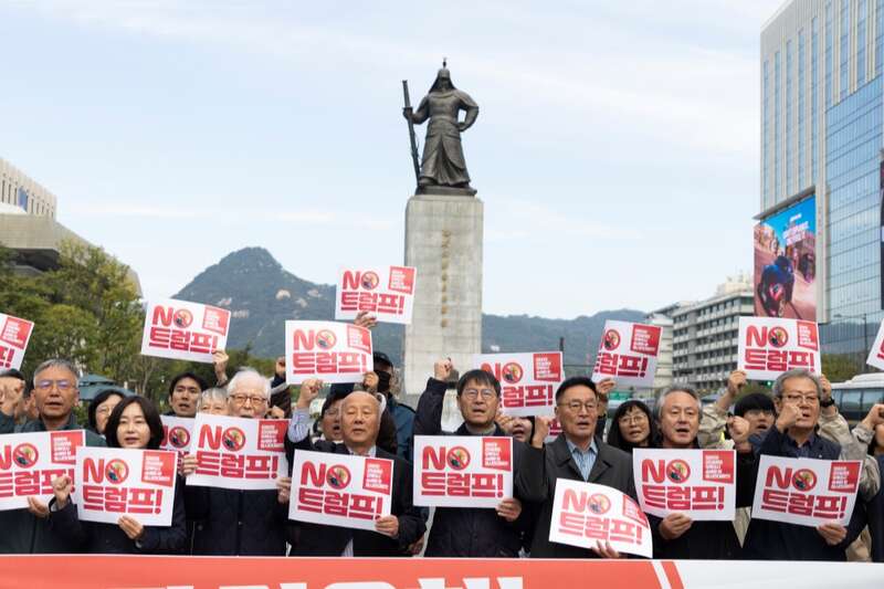 2025年10月21日,首尔,民众在美国驻韩大使馆附近举行集会,手举“不要特朗普”标语,抗议特朗普对韩投资推动及关税政策。 东方IC