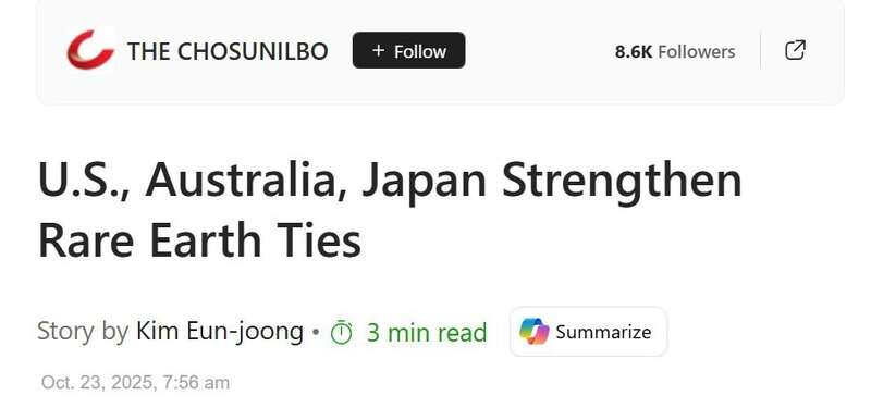 10月23日,韩国的《朝鲜日报》在以“美国、澳大利亚、日本加强稀土整合”为题,报道了美国与澳大利亚签订稀土合作协议后,日美稀土合作也有了新动向得消息。