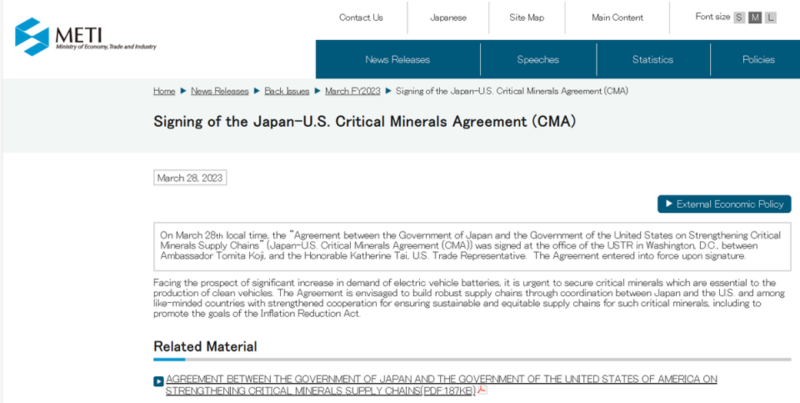 再往前,2023年3月28日,《日本政府与美国政府关于加强关键矿产供应链的协定》由日本驻美国大使富田浩二和美国贸易代表凯瑟琳·戴在华盛顿特区的美国贸易代表办公室签署。该协定自签署后生效。上图为日本经济产业省官网的公告。