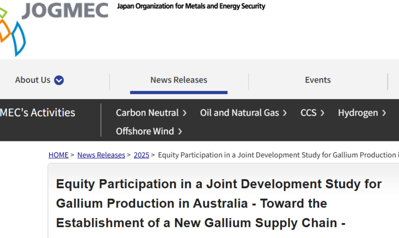 上图是日本JOGMEC官网宣布参与西澳镓精炼厂投资的新闻稿截图。