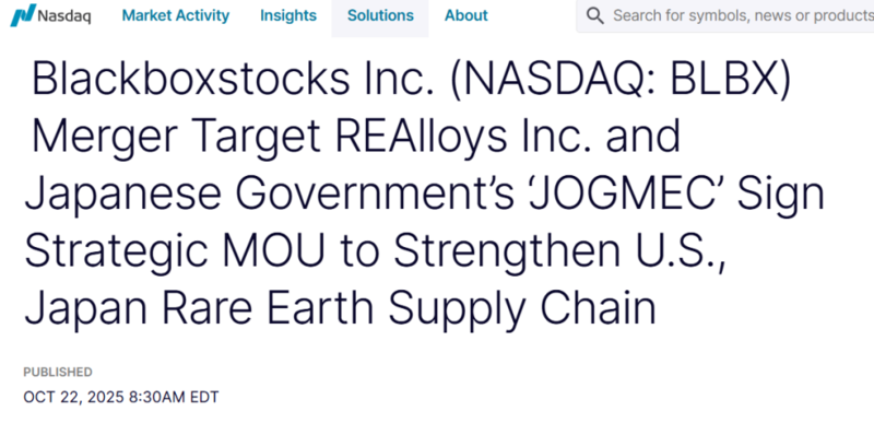 10月22日,正在与REalloys合并的在纳斯达克上市的Blackboxstocks Inc.发布公告称(见上图),该协议在谅解备忘录(MoU)中概述,规定了联合开发、技术转让和工业安全合作的框架。