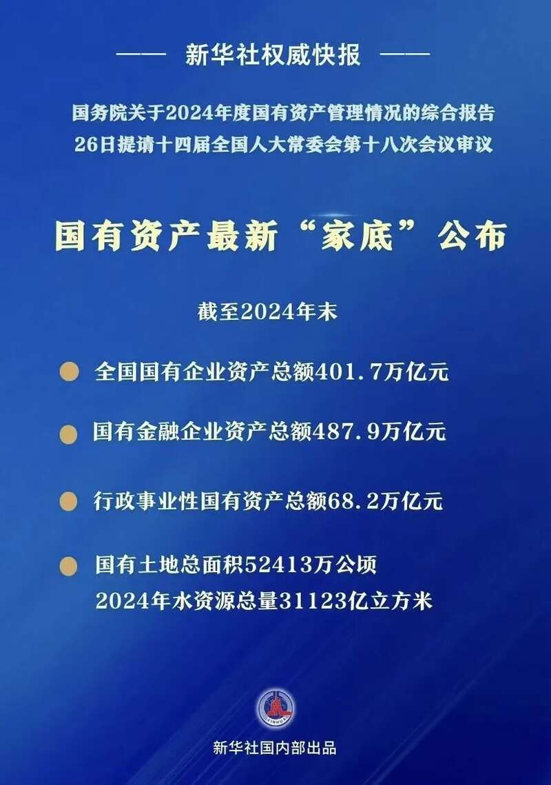 10月26日,国务院关于2024年度国有资产管理情况的综合报告提请十四届全国人大常委会第十八次会议审议,国有资产最新“家底”公布。截至2024年末,全国国有企业(不含金融企业)资产总额401.7万亿元、国有资本权益109.4万亿元。国有金融企业资产总额487.9万亿元、国有金融资本权益33.9万亿元。报告还公布了行政事业性国有资产和国有自然资源资产的情况。