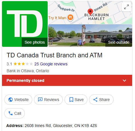 不久前,TD银行位于安省Blackburn Hamlet的分行已经关门。