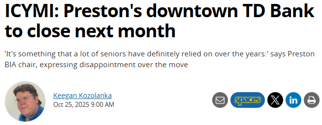 今年11月7日,TD银行还将关闭其位于剑桥市King Street E.和Westminster Drive拐角处的另一家分行,业务迁至其他分行。