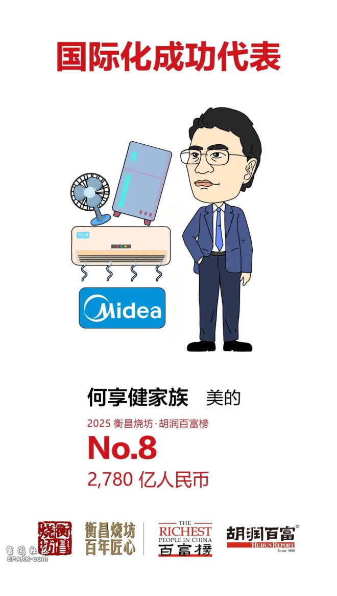 83岁的何享健及其家族财富比去年增长430亿元(+18%),以2780亿元位列第八,下降三位。美的去年业绩再创历史新高,营收4071亿元,同比增长9.4%;归母净利润385亿元,同比增长14%。其中,ToB业务作为“第二引擎”,持续保持高速增长,收入1045亿元。去年,美的完成H股发行,A+H双平台落地,进一步助力全球突破战略。何享健最近一年分红90多亿元。