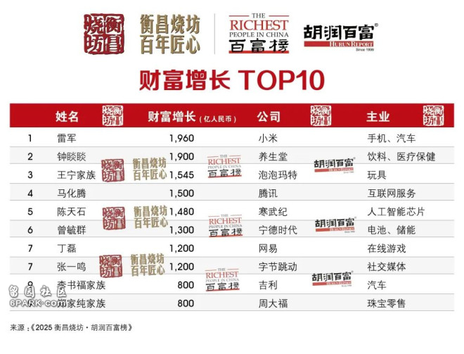“新能源汽车及电池领域,受益于政策利好与全球市场需求双轮驱动,小米的雷军与宁德时代表现尤为亮眼。雷军财富比去年增加近2000亿元,是今年财富增长最多的企业家;宁德时代的曾毓群、黄世霖及另外五位成员财富均增长近70%,曾毓群以3300亿元再次进入榜单前五,黄世霖则以1500亿元进入前30。”