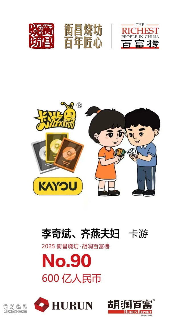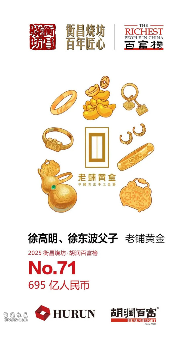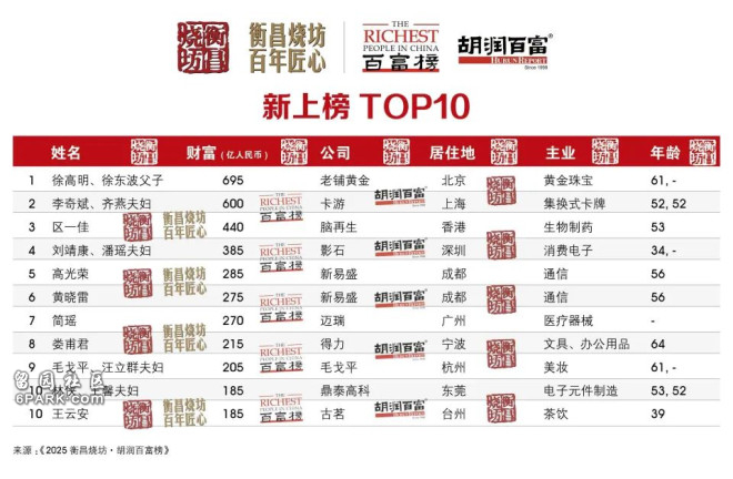 ● 376位新面孔,为去年的7倍。新人之首是老铺黄金的徐高明、徐东波父子,以695亿元财富跻身前100;其次是集换式卡牌龙头卡游的李奇斌、齐燕夫妇,财富600亿元。新人前十还包括智能影像设备企业影石34岁的刘靖康与其妻子潘瑶,财富385亿元。此外,“奶茶”界知名品牌古茗、霸王茶姬和沪上阿姨成功上市,创始人39岁的王云安、30岁的张俊杰和47岁的单卫钧与其妻子周蓉蓉分别以185亿元、135亿元和95亿元财富首次上榜。