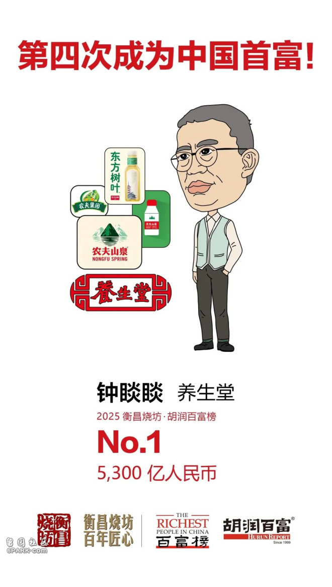 “钟睒睒以5300亿元第四次成为中国首富,并刷新了中国首富的财富纪录。他是继马云之后,第二位实现‘四度登顶’的企业家,巧合的是,两人都是绍兴人。在新能源汽车、消费电子、AI等赛道蓬勃发展的时代,引人思考的是:为什么中国首富仍是一位70多岁、卖水的企业家?而且,无论是总财富还是财富增长规模,他几乎都居于首位。钟睒睒80%的财富来源于农夫山泉。他是中国14亿人口超大内需市场的典型代表。近年来,农夫山泉持续推动产品高端化与品牌升级,也成为中国企业高质量发展的一个缩影。”