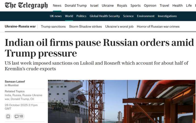 美国上周对卢克石油公司和俄罗斯石油公司实施了制裁,这两家公司约占克里姆林宫原油出口的一半。10月28日《每日电讯报》报道称,在华盛顿对莫斯科顶级能源公司实施新制裁后,印度炼油商悄悄暂停了对俄罗斯石油的新采购。