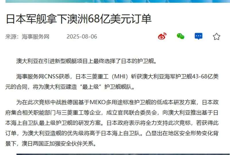 今年8月,澳大利亚宣布购买日本11艘“最上级护卫舰”,总金额超过100亿澳元。