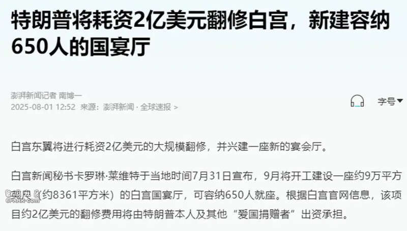 另外,看到白宫东翼正在改建的工程了吗?特总拆的!大统领要在白宫建造一个大型的国宴厅、翻新白宫,还要在白宫花园设立金色的雕像。这个初步预算就是2亿美元。