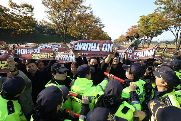 10月29日,抗议特朗普的韩国民众与警方发生对峙。 东方IC
