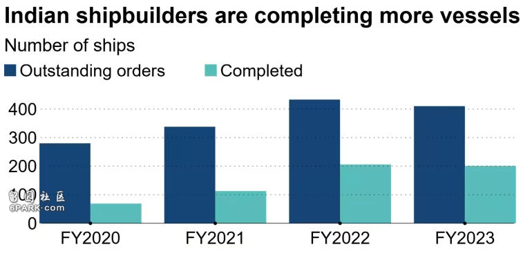 根据印度官方数据,印度在2023财年完成200艘船舶,是2020财年的约三倍。