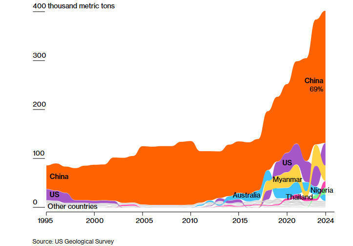 多项数据显示,中国在稀土开采生产中占据主导地位。 彭博社制图