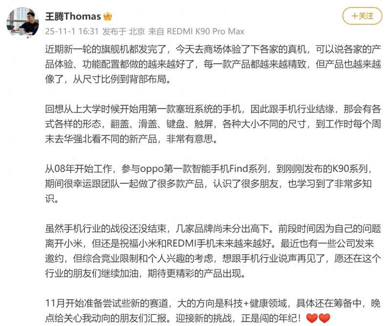 11月1日,王腾在个人微博上发文称:最近也有一些公司发来邀约,但综合竞业限制和个人兴趣的考虑,想跟手机行业说声再见了,愿还在这个行业的朋友们继续加油,期待更精彩的产品出现。11月开始准备尝试些新的赛道,大的方向是科技+健康领域,具体还在筹备中。