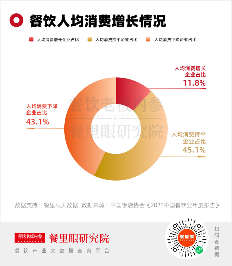 中国饭店协会《2025 中国餐饮业年度报告》的一组数据也印证了这一点:仅 11.8% 的企业客单价实现增长,而客单价持平与下降的企业占比分别达45.1% 和43.1%,两者合计近九成。