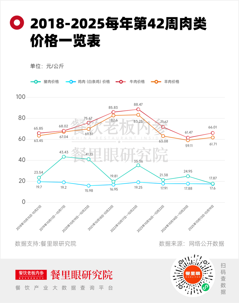 内参君统计了自2018年以来,每年第42周(基本在10月中下旬)的肉类价格作为参考。