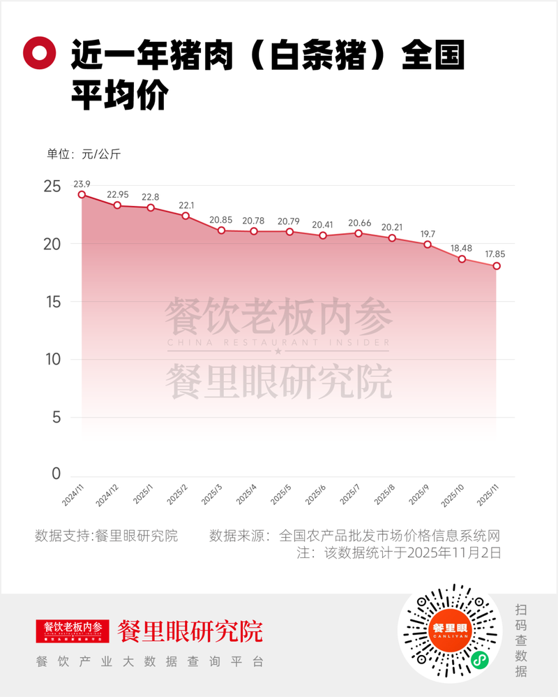 农业农村部数据显示,2025年10月第3周全国猪肉平均价格23.11元/公斤,环比下跌1.1%,同比下跌22.0%;10月24日,猪肉平均价格仅为17.73元/公斤,比国庆前又下跌9.3% 。