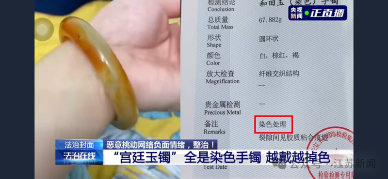 “宫廷玉镯”全是染色手镯 越戴越掉色