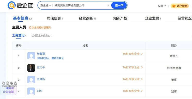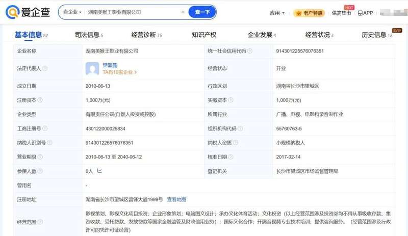 爱企查App显示,湖南美猴王影业有限公司成立于2010年6月,注册资本1000万元,经营范围包括影视策划、影视文化项目投资等,由北京美猴王国文化发展有限公司、山西通宇文化传播有限公司、樊馨蔓(张纪中前妻)共同持股,其中樊馨蔓持股5%。