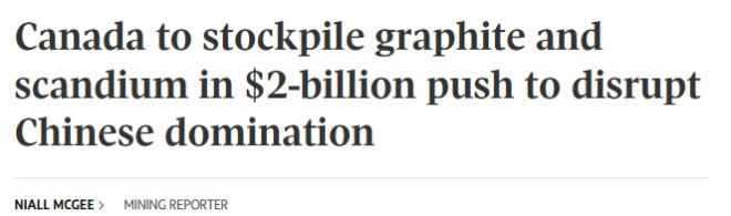 渥太华刚刚公布了全新20亿加元关键矿产投资计划,将开始囤积加拿大本土生产的石墨(graphite)和钪(scandium)。该计划旨在资助加拿大境内关键矿产矿山与加工厂建设,以挑战中国在全球关键矿产领域的主导地位,并缓解西方国家对供应短缺的担忧。
