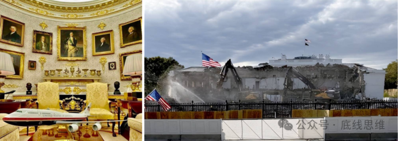 短短9个月,原本素净的椭圆形办公室已是左图这般金碧辉煌,底下那架总统新专机难产已有七八年,机身一道红油漆的改动便报价2亿美元。而白宫更大的拆迁改造正在特朗普亲自督工下如火如荼,美国的效率都在这里了……