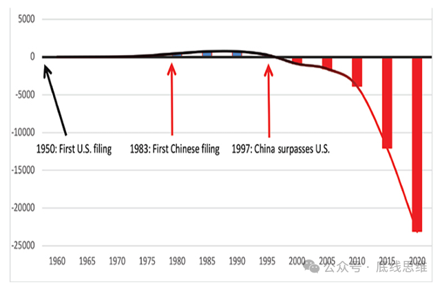 正是在美国不断出台政策的时候,中美相关专利差距也越来越大。图表来源:ThREE consulting。