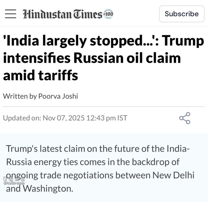 印度《印度斯坦时报》官网11月7日报道:美国总统特朗普在声称印度将很快暂停其与俄罗斯的石油贸易数天后,进一步强化了这一说法,现在称印度已“基本停止”(“largely stopped”)购买。